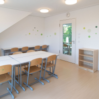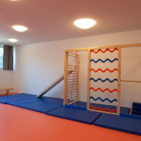 Nach 1 ½ Jahren Bauzeit konnten unsere Hortkinder und das Hort-Team endlich die neuen Räume im 1. Obergeschoss unseres Neubaus beziehen. Das Zentrum bildet der große und lichtdurchflutete Gruppenraum. Hier werden die Kinder begrüßt. Hier finden die täglichen Gruppengespräche und vieles mehr statt. Von diesem Raum gehen die Funktionsräume ab: Kreativraum, Hausaufgabenzimmer, Ruhe- und Bauraum. Die Klarheit der Raumaufteilung wird durch die Möbel aufgegriffen: Sie sind zweckmäßig und robust und laden ein, sie ihrem Verwendungszweck gemäß zu gebrauchen. Das Highlight für unsere Hortkinder ist jedoch der Mehrzweckraum mit der Klappturnwand sowie den Deckenhaken, die durch anhängen von Schaukelball und Duo-Schaukel viele Bewegungsmöglichkeiten zulassen.