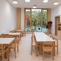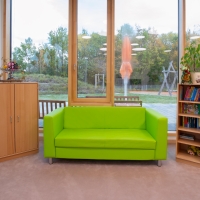Der Kinderhort in Unterföhring bietet Platz für acht Gruppenräume, die alle einem bestimmten Thema nachgehen. Die Möbel sind sehr praktisch und können flexibel im Raum platziert werden. Für eine kleine Ruhepause laden die Leseecken mit den Sofas ein und zum Lernen können sich die Kinder in den Hausaufgabenraum zurückziehen.