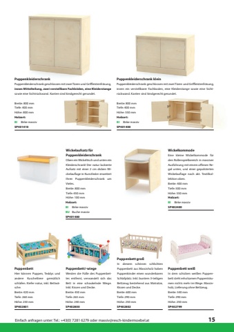 Einfach anfragen unter: Tel.: +43(0) 7281 6279 oder massiv@resch-kindermoebel.at15PuppenkleiderschrankPuppenkleiderschrank kleinSP401410SP401400H%u00f6he: 800 mmH%u00f6he: 550 mmTiefe: 400 mmTiefe: 400 mmBreite: 800 mmBreite: 800 mmPuppenkleiderschrank geschlossen mit zwei T%u00fcren und Griffleistenfr%u00e4sung, innen ein verstellbarer Fachboden, eine Kleiderstange sowie eine Sichtr%u00fcckwand. Kanten sind kindgerecht gerundet.Puppenkleiderschrank geschlossen mit zwei T%u00fcren und Griffleistenfr%u00e4sung, innen Mittelteilung, zwei verstellbare Fachb%u00f6den, eine Kleiderstangesowie eine Sichtr%u00fcckwand. Kanten sind kindgerecht gerundet.Wickelaufsatz f%u00fcrPuppenkleiderschrankBreite: 800 mmSP401480Tiefe: 450 mmH%u00f6he: 100 mmOben ein Wickeltisch und unten ein Kleiderschrank! Der natur lackierte Aufsatz mit einer 2 cm dicken Wickelauflage in Kunstleder erweitert Ihren Puppenkleiderschrank um Vieles.Puppenbett/-wiegePuppenbett gro%u00dfSP402800SP402802H%u00f6he: 240 mmH%u00f6he: 250 mmTiefe: 265 mmTiefe: 290 mmBreite: 450 mmBreite: 600 mmWerden die F%u00fc%u00dfe des Puppenbettes entfernt, verwandelt sich das Bett in eine schaukelnde Wiege. Inkl. Kissen und Decke.In diesem sch%u00f6nen schlichten Puppenbett aus Massivholz haben Puppenkinder einen wunderbaren Schlafplatz. Inkl. buntem 3-teiligen Bettzeug bestehend aus Matratze, Kissen und Decke.PuppenbettPuppenbett wei%u00dfSP402801SP402799H%u00f6he: 230 mmH%u00f6he: 250 mmTiefe: 260 mmTiefe: 290 mmBreite: 420 mmBreite: 540 mmHier k%u00f6nnen Puppen, Teddys und andere Kuscheltiere gem%u00fctlich schlafen. Kiefer natur, inkl. Bettw%u00e4sche.In dem schicken wei%u00dfen Puppenbett steht erholsamen Puppentr%u00e4umen nichts mehr im Wege. Massivholz, Lieferung ohne Bettzeug.WickelkommodeSP402400H%u00f6he: 550 mmTiefe: 500 mmBreite: 400 mmEine kleine Wickelkommode f%u00fcr den Rollenspielbereich in massiver Ausf%u00fchrung mit einem offenen Regal unten, und einer gepolsterten Wickelauflage nach akt. Textilkollektion oben.Birke massivBirke massivBuche massivBIBirke massivBIBUBIHolzart:Holzart:Holzart:Birke massivHolzart:BI