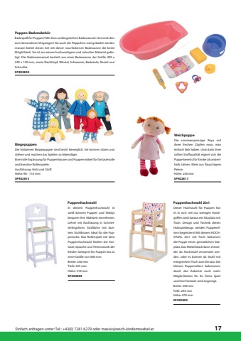 Einfach anfragen unter: Tel.: +43(0) 7281 6279 oder massiv@resch-kindermoebel.at17Puppen-Badezubeh%u00f6rSP402830Badespa%u00df f%u00fcr Puppen! Mit dem umfangreichen Badewannen-Set wird dies zum besonderen Vergn%u00fcgen! Da auch die P%u00fcppchen mal gebadet werden m%u00fcssen bietet dieses Set mit dieser rosa-farbenen Badewanne die beste M%u00f6glichkeit. Sie ist aus einem hochwertigem und robusten Material gefertigt. Das Badewannenset besteht aus einer Badewanne der Gr%u00f6%u00dfe 405 x 230 x 130 mm, sowie Nachttopf, Windel, Schwamm, Badeente, Rassel und Schnuller.WeichpuppeSP402817H%u00f6he: 250 mmDie sommersprossige Roya mit ihren frechen Z%u00f6pfen muss man einfach lieb haben. Und dank ihrer soften Stoffqualit%u00e4t eignet sich die Puppe bereits f%u00fcr Kinder ab anderthalb Jahren. Kleid aus flauschigem Fleece.BiegepuppenSP402815H%u00f6he: 90 - 110 mmDie h%u00f6lzernen Biegepuppen sind leicht beweglich. Sie k%u00f6nnen sitzen und stehen und machen das Spielen so lebendiger.%u00a0Eine tolle Erg%u00e4nzung f%u00fcr Puppenh%u00e4user und Puppenm%u00f6bel f%u00fcr fantasievolle und kreative Rollenspiele.Ausf%u00fchrung: Holz und Stoff.PuppenhochstuhlPuppenhochstuhl 2in1SP402803SP402804H%u00f6he: 510 mmH%u00f6he: 470 mmTiefe: 225 mmTiefe: 245 mmBreite: 250 mmBreite: 250 mmIn diesem Puppenhochstuhl in wei%u00df k%u00f6nnen Puppen und Teddys bequem ihre Mahlzeit einnehmen. Lehne mit Ausfr%u00e4sung in Schmetterlingsform. Sitzfl%u00e4che mit buntem Stuhlkissen. Ideal f%u00fcr die Puppenecke. Das Rollenspiel mit dem Puppenhochstuhl f%u00f6rdert die Fantasie, Sprache und Feinmotorik der Kinder. Geeignet f%u00fcr Puppen bis zu einer Gr%u00f6%u00dfe von 500 mm.Dieser Hochstuhl f%u00fcr Puppen hat es in sich: mit nur wenigen Handgriffen wird daraus ein Sitzplatz mit Tisch. Design und Technik dieses Holzspielzeugs werden Puppeneltern begeistern! Mit diesem HOCHSTUHL 2in1 mit Tisch bekommt die Puppe einen gem%u00fctlichen Sitzplatz. Das M%u00f6belst%u00fcck kann entweder als Hochstuhl verwendet werden, oder es kommt als Stuhl mit integriertem Tisch zum Einsatz. Die kleinen Puppeneltern bekommen durch das Zubeh%u00f6r noch mehr M%u00f6glichkeiten f%u00fcr ihr freies Spiel und ihre Fantasie wird angeregt.