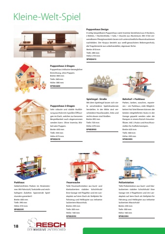 18Puppenhaus 2-EtagenPuppenhaus 3-EtagenSP402600SP402610H%u00f6he: 380 mmH%u00f6he: 875 mmTiefe: 260 mmTiefe: 350 mmBreite: 400 mmBreite: 650 mmPuppenhaus inklusive beweglicher Einrichtung, ohne Puppen.Sehr robuste und stabile Ausf%u00fchrung aus Holz mit 2 gro%u00dfen %u00d6ffnungen im Dach, welches zur besseren Bespielbarkeit auch abgenommen werden kann. Ohne Inventar, M%u00f6bel oder Puppen.Puppenhaus DesignSP402615H%u00f6he: 210 mmTiefe: 280 mmBreite: 810 mm4-seitig bespielbares Puppenhaus samt Inventar bestehend aus 4 Hockern, 2 Betten,%u00a01 K%u00fcchentheke, 1 Sofa. 1 Dusche aus Aluminium.%u00a0Mit 4 frei verwendbaren Plexiglaswinkeln lassen sich unterschiedliche Raumsituationen nachbilden. Der Korpus besteht aus wei%u00df-gewachstem Birkensperrholz, die Tragelemente aus unbehandelter, s%u00e4gerauer Eiche.Parken, tanken, waschen, reparieren %u2013 ein Parkhaus, viele M%u00f6glichkeiten! Auf drei Ebenen k%u00f6nnen die beiden mitgelieferten Autos in der Garage geparkt werden oder die Rampen in einem Rutsch hinunterflitzen. Inkl. 2 Autos und Anschlussstellen f%u00fcr Auffahrtsrampen.Mit dem Spielregal lassen sich viele verschiedene Spielsituationen herstellen. In der Mitte sind verschiedene Hausfassaden, links und rechts davon sind Stra%u00dfen.Geb%u00fchrenfreies Parken im Kinderzimmer. Mit Fahrstuhl, Tankstelle und reichhaltigem Zubeh%u00f6r. Spannende Spielstunden garantiert!Tolle Feuerwehrstation aus bunt- und klarlackiertem stabilen Schichtholz! Eine Garage mit Fl%u00fcgelt%u00fcr und ein Landeplatz auf dem Dach als Stellplatz f%u00fcr Fahrzeug und Helikopter aus teilweise lackiertem Massivholz.Spielregal - Stra%u00dfeBahnhof + ParkhausParkhausFeuerwacheBreite: 620 mmBreite: 892 mmBreite: 600 mmBreite: 230 mmSP402595SP403950SP402591SP402593Tiefe: 360 mmTiefe: 720 mmTiefe: 390 mmTiefe: 300 mmH%u00f6he: 430 mmH%u00f6he: 670 mmH%u00f6he: 410 mmH%u00f6he: 160 mmTolle Polizeistation aus bunt- und klarlackiertem stabilen Schichtholz! Eine Garage mit 2 Fl%u00fcgelt%u00fcren und ein Landeplatz auf dem Dach als Stellplatz f%u00fcr Fahrzeug und Helikopter aus teilweise lackiertem Massivholz!PolizeistationBreite: 230 mmSP402594Tiefe: 300 mmH%u00f6he: 160 mmKleine-Welt-Spiel