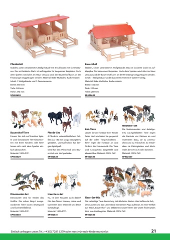 Einfach anfragen unter: Tel.: +43(0) 7281 6279 oder massiv@resch-kindermoebel.at21PferdestallBauernhofPferde-SetHaustiere-SetBauernhof-TiereDinosaurier-SetZoo-TiereTiere-Set-MixWildtiere-SetSP402620SP402622SP402628SP402631SP402629SP402630SP402626SP402632SP402627H%u00f6he: 270 mmH%u00f6he: 280 mmTiefe: 340 mmTiefe: 320 mmBreite: 550 mmBreite: 550 mmStabiles, sch%u00f6n verarbeitetes%u00a0Stallgeb%u00e4ude mit 3 Stallboxen mit Schiebet%u00fcren. Das rot lackierte Dach ist aufklappbar f%u00fcr bequemes Bespielen.%u00a0Nach dem Spielen wird alles im Haus verstaut und der Bauernhof kann an der Firststange weggetragen werden.%u00a0Material: Birke Multiplex, Buche massiv.Inhalt: 1 Stallgeb%u00e4ude und 7 Zaunelemente.Stabiles, sch%u00f6n verarbeitetes%u00a0 Hofgeb%u00e4ude. Das rot lackierte Dach ist aufklappbar f%u00fcr bequemes Bespielen.%u00a0 Nach dem Spielen wird alles im Haus verstaut und der Bauernhof kann an der Firststange weggetragen werden.%u00a0Inhalt: 1 Stallgeb%u00e4ude und 8 Zaunelemente%u00a0mit 1 Gatter 4-seitig.Material: Birke Multiplex, Buche massiv.4 Pferde in unterschiedlichen Gr%u00f6%u00dfen (ca. 130 mm lang), naturgetreu gestaltet, unempfindlich f%u00fcr langen Spielspa%u00df.Ideal f%u00fcr den Pferdehof, den Bauernhof und die Spielecke.Na, ist dein Haustier auch dabei? Gib den Tieren Namen, spiele und k%u00fcmmere dich liebevoll um deine Sch%u00fctzlinge.Material: 100% PVC.Freuen Sie sich auf%u00a0 kreative Spiele%u00a0 und%u00a0 fantastische Tier-Geschichten%u00a0 mit Ihren Kindern. Alle Tiere lassen sich nach dem Spielen einfach%u00a0abwaschen.Material: 100% PVC.Dinosaurier sind f%u00fcr Kinder das Gr%u00f6%u00dfte. Die schon l%u00e4ngst ausgestorbenen Tiere waren riesengro%u00df und furchteinfl%u00f6%u00dfend. Material: 100% PVC.Lassen Sie der Fantasie ihrer Kinder freien Lauf und seien Sie gespannt auf die tollen Tiergeschichten. . Tiere regen die Fantasie an und f%u00f6rdern die Feinmotorik. Die Tiere sind naturgetreu dargestellt und abwaschbar. Material: 100% PVC.Die vielseitige Tiere-Sammlung hat allerlei zu bieten: Hier treffen die Kuh, Dinosaurier und das L%u00f6wenkind mit seinem Papa aufeinan. In einer Vielfalt aus Wald-, Bauernhof- und Wildtieren sowie Tieren der Urzeit findet jedes Kind sein Lieblingstier. Material: 100% PVC.Die faszinierenden und detailgetreu nachgebildeten Tiere regen die Fantasie der Kleinen an und motivieren dazu, sie zu untersuchen und zu erforschen. So entdecken sie Kleinigkeiten und Merkmale, die sie noch nicht kannten. Material: 100% PVC.