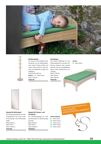 Einfach anfragen unter: Tel.: +43(0) 7281 6279 oder massiv@resch-kindermoebel.at23Kleiderst%u00e4nderKinderliegeSP402100SP402300H%u00f6he: 1150 mmH%u00f6he: 400 mmTiefe: 540 mmDurchmesser: 300 mmBreite: 1189 mmEin massiver und standfester Kleiderst%u00e4nder f%u00fcr den Rollenspielbereich. Durch leichtes Design und frische Farben ideal f%u00fcr einen Bereich zum Wohlf%u00fchlen. Farben laut Abbildung.Eine kleine Kinderliege f%u00fcr den Rollenspielbereich in massiver Ausf%u00fchrung inklusive einer weichen Matratze laut akt. Textilkollektion. Bezug mittels Rei%u00dfverschluss abnehmbar.Spiegel f%u00fcr RollenspielSP401800H%u00f6he: 1100 mmTiefe: 28 mmBreite: 500 mmEin Ganzk%u00f6rperspiegel f%u00fcr den Rollenspielbereich mit einem eingefassten Spiegel - keine Verletzungsgefahr.Spiegel f%u00fcr Theater- und TanzspieleBreite: 800 mmWE400020Tiefe: 28 mmH%u00f6he: 1600 mmEin Ganzk%u00f6rperspiegel f%u00fcr viele Anwendungen. F%u00fcr Wandmontage gerichtet.Noch mehr Spiegel finden Sie in unserem Katalog %u201eWANDGESTALTUNG | PARAVENTS%u201c.BIBirke massivHolzart:Holzart:BIBirke massivBirke massivEiche massivEsche massivBuche massivAhorn massivBIEIESBUAHHolzart Spiegel: