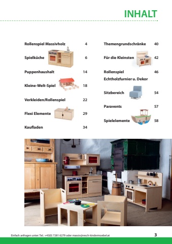 Einfach anfragen unter: Tel.: +43(0) 7281 6279 oder massiv@resch-kindermoebel.at3INHALTRollenspiel MassivholzSpielk%u00fcchePuppenhaushaltKleine-Welt-SpielVerkleiden/RollenspielFlexi ElementeKaufladen461418222934Themengrundschr%u00e4nke F%u00fcr die KleinstenRollenspielEchtholzfurnier u. DekorSitzbereichParaventsSpielelemente404246545758