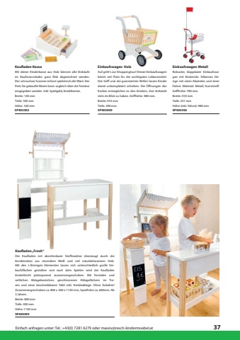 Einfach anfragen unter: Tel.: +43(0) 7281 6279 oder massiv@resch-kindermoebel.at37Kaufladen-KassaSP403302Mit dieser Kinderkasse aus Holz k%u00f6nnen alle Eink%u00e4ufe im Kaufmannsladen ganz flink abgerechnet werden.Der schnurlose Scanner erfasst spielerisch die Ware. Der Preis f%u00fcr gekaufte Waren kann sogleich %u00fcber die Tastatur eingegeben werden. Inkl. Spielgeld, Kreditkarten.Einkaufswagen HolzEinkaufswagen MetallSP403400SP403450H%u00f6he: 160 mmH%u00f6he (inkl. Fahne): 980 mmTiefe: 100 mmTiefe: 231 mmTiefe: 290 mmBreite: 140 mmBreite: 410 mmBreite: 410 mmAuf geht%u2019s zur Shoppingtour! Dieser Einkaufswagen bietet viel Platz f%u00fcr die wichtigsten Lebensmittel. Der Griff und die gummierten Reifen lassen Kinder damit unkompliziert schieben. Die %u00d6ffnungen des Korbes erm%u00f6glichen es den Kindern, ihre Eink%u00e4ufe stets im Blick zu haben. Griffh%u00f6he: 480 mm.Robuster, klappbarer Einkaufswagen mit Kindersitz. Silbernes Design mit roten Akzenten und einer Fahne. Material: Metall, Kunststoff. Griffh%u00f6he: 700 mm.Kaufladen %u201eFresh%u201cSP404495H%u00f6he: 1130 mmTiefe: 300 mmBreite: 800 mmDer Kaufladen mit abnehmbarer Stoffmarkise %u00fcberzeugt durch die Kombination aus neutralem Wei%u00df und viel naturbelassenem Holz. Mit den L-f%u00f6rmigen Elementen lassen sich unterschiedlich gro%u00dfe Verkaufsfl%u00e4chen gestalten und nach dem Spielen wird der Kaufladen kinderleicht platzsparend zusammengeschoben. Mit frontalen und seitlichen Ablagebereichen, geschlossenen Ablagef%u00e4chern im Tresen und einer beschreibbaren Tafel inkl. Kreideablage. Ohne Zubeh%u00f6r!Zusammengeschoben ca. 800 x 300 x 1130 mm, Spielh%u00f6he ca. 600mm. Ab 3 Jahren.