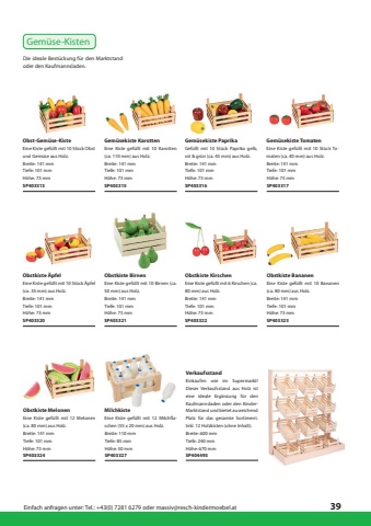 Einfach anfragen unter: Tel.: +43(0) 7281 6279 oder massiv@resch-kindermoebel.at39Obst-Gem%u00fcse-KisteObstkiste MelonenObstkiste %u00c4pfelGem%u00fcsekiste PaprikaObstkiste KirschenGem%u00fcsekiste KarottenMilchkisteVerkaufsstandObstkiste BirnenGem%u00fcsekiste TomatenObstkiste BananenBreite: 141 mmBreite: 141 mmBreite: 141 mmBreite: 141 mmBreite: 141 mmBreite: 141 mmBreite: 110 mmBreite: 600 mmBreite: 141 mmBreite: 141 mmBreite: 141 mmSP403313SP403324SP403320SP403316SP403322SP403315SP403327SP404493SP403321SP403317SP403323Tiefe: 101 mmTiefe: 101 mmTiefe: 101 mmTiefe: 101 mmTiefe: 101 mmTiefe: 101 mmTiefe: 85 mmTiefe: 240 mmTiefe: 101 mmTiefe: 101 mmTiefe: 101 mmH%u00f6he: 73 mmH%u00f6he: 73 mmH%u00f6he: 73 mmH%u00f6he: 73 mmH%u00f6he: 73 mmH%u00f6he: 73 mmH%u00f6he: 50 mmH%u00f6he: 670 mmH%u00f6he: 73 mmH%u00f6he: 73 mmH%u00f6he: 73 mmEine Kiste gef%u00fcllt mit 10 St%u00fcck Obst und Gem%u00fcse aus Holz.Die ideale Best%u00fcckung f%u00fcr den Marktstand oder den Kaufmannsladen.Eine Kiste gef%u00fcllt mit 12 Melonen (ca. 80 mm) aus Holz.Eine Kiste gef%u00fcllt mit 10 St%u00fcck %u00c4pfel (ca. 35 mm) aus Holz.Gef%u00fcllt mit 10 St%u00fcck Paprika gelb, rot & gr%u00fcn (ca. 45 mm) aus Holz.Eine Kiste gef%u00fcllt mit 6 Kirschen (ca. 80 mm) aus Holz.Eine Kiste gef%u00fcllt mit 10 Karotten (ca. 110 mm) aus Holz.Eine Kiste gef%u00fcllt mit 12 Milchflaschen (55 x 20 mm) aus Holz.Einkaufen wie im Supermarkt! Dieser Verkaufsstand aus Holz ist eine ideale Erg%u00e4nzung f%u00fcr den Kaufmannsladen oder den KinderMarktstand und bietet ausreichend Platz f%u00fcr das gesamte Sortiment. Inkl. 12 Holzkisten (ohne Inhalt).Eine Kiste gef%u00fcllt mit 10 Birnen (ca. 50 mm) aus Holz.Eine Kiste gef%u00fcllt mit 10 St%u00fcck Tomaten (ca. 40 mm) aus Holz.Eine Kiste gef%u00fcllt mit 10 Bananen (ca. 80 mm) aus Holz.Gem%u00fcse-Kisten