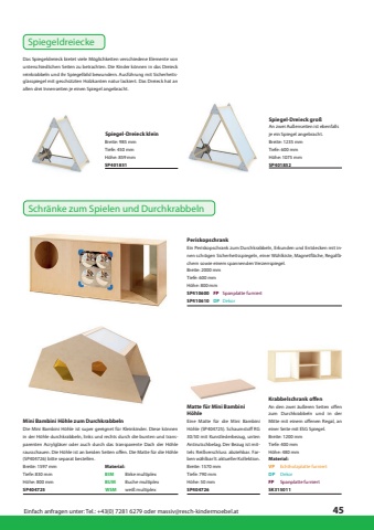 Einfach anfragen unter: Tel.: +43(0) 7281 6279 oder massiv@resch-kindermoebel.at45BIMBUMWSMBirke multiplexBuche multiplexwei%u00df multiplexMaterial:Spiegel-Dreieck kleinSpiegel-Dreieck gro%u00dfBreite: 985 mmBreite: 1235 mmAn zwei Au%u00dfenseiten ist ebenfalls je ein Spiegel angebracht.SP401851SP401852Tiefe: 450 mmTiefe: 600 mmH%u00f6he: 859 mmH%u00f6he: 1075 mmDas Spiegeldreieck bietet viele M%u00f6glichkeiten verschiedene Elemente von unterschiedlichen Seiten zu betrachten. Die Kinder k%u00f6nnen in das Dreieck reinkrabbeln und ihr Spiegelbild bewundern. Ausf%u00fchrung mit Sicherheitsglasspiegel mit gesch%u00fctzten Holzkanten natur lackiert. Das Dreieck hat an allen drei Innenseiten je einen Spiegel angebracht.DPFPDekorSpanplatte furniertPeriskopschrankBreite: 2000 mmTiefe: 600 mmSP410600SP410610H%u00f6he: 800 mmEin Periskopschrank zum Durchkrabbeln, Erkunden und Entdecken mit innen schr%u00e4gen Sicherheitsspiegeln, einer W%u00fchlkiste, Magnetfl%u00e4che, Regalf%u00e4chern sowie einem spannenden Verzerrspiegel.SpiegeldreieckeSchr%u00e4nke zum Spielen und DurchkrabbelnMini Bambini H%u00f6hle zum DurchkrabbelnMatte f%u00fcr Mini Bambini H%u00f6hleSP404725SP404726H%u00f6he: 800 mmH%u00f6he: 50 mmTiefe: 830 mmTiefe: 790 mmBreite: 1597 mmBreite: 1570 mmDie Mini Bambini H%u00f6hle ist super geeignet f%u00fcr Kleinkinder. Diese k%u00f6nnen in der H%u00f6hle durchkrabbeln, links und rechts durch die bunten und transparenten Acrylgl%u00e4ser oder auch durch das transparente Dach der H%u00f6hle rausschauen. Die H%u00f6hle ist an beiden Seiten offen. Die Matte f%u00fcr die H%u00f6hle (SP404726) bitte separat bestellen.Eine Matte f%u00fcr die Mini Bambini H%u00f6hle (SP404725). Schaumstoff RG 30/50 mit Kunstlederbezug, unten Antirutschbelag. Der Bezug ist mittels Rei%u00dfverschluss abziehbar. Farben w%u00e4hlbar lt. aktueller Kollektion.Krabbelschrank offenBreite: 1200 mmTiefe: 400 mmSK315011H%u00f6he: 480 mmAn den zwei %u00e4u%u00dferen Seiten offen zum Durchkrabbeln und in der Mitte mit einem offenen Regal, an einer Seite mit ESG Spiegel.Material:DekorEchtholzplatte furniertSpanplatte furniertDPVPFP