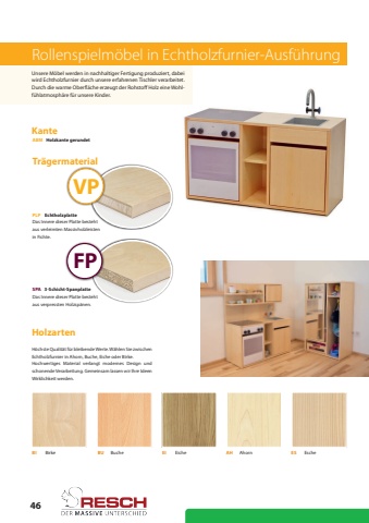 46HolzartenKanteTr%u00e4germaterialH%u00f6chste Qualit%u00e4t f%u00fcr bleibende Werte. W%u00e4hlen Sie zwischen Echtholzfurnier in Ahorn, Buche, Eiche oder Birke.Hochwertiges Material verlangt modernes Design und schonende Verarbeitung. Gemeinsam lassen wir Ihre Ideen Wirklichkeit werden.Unsere M%u00f6bel werden in nachhaltiger Fertigung produziert, dabei wird Echtholzfurnier durch unsere erfahrenen Tischler verarbeitet. Durch die warme Oberfl%u00e4che erzeugt der Rohstoff Holz eine Wohlf%u00fchlatmosph%u00e4re f%u00fcr unsere Kinder.ABMHolzkante gerundetRollenspielm%u00f6bel in Echtholzfurnier-Ausf%u00fchrungDas Innere dieser Platte besteht aus verleimten Massivholzleisten in Fichte.Das Innere dieser Platte besteht aus verpressten Holzsp%u00e4nen.PLPSPAEchtholzplatte3-Schicht-SpanplatteFPVPBIBirkeBUBucheEIEicheAHAhornESEsche