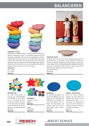 102...MACHT SCHULEBierdeckel-SetDas ideale Arbeitskonzept zur Schulung der Koordinationsleistung. Ben%u00f6tigt ca. 16 qm Fl%u00e4che, um mit ca. 30 Kindern oder 25 Erwachsenen zu arbeiten. Einsetzbar in allen Altersstufen! Mit Spielanleitung. 400 St%u00fcck (je 100 Stk blau, gelb, gr%u00fcn, rot). Einseitig bedruckt. GS-gepr%u00fcft.BW511040BALANCIERENBalance - Dynair Kissen %u00d8 300 mmDurch die samtige Oberfl%u00e4che erreichen Sie eine h%u00f6here Luftzirkulation beim Sitzen. Auch zur Gleichgewichtsschulung, in der Feinmotorik, zum Beckenbodentraining, f%u00f6rdert Koordination und Reaktion. Aus Ruton, mit Ventil. Farbe in T%u00fcrkis oder Himbeer.BW511120KreisfliesenDie Bodenmarkierungsfliese eignet sich zum Markieren von Laufwegen und zur Abgrenzung von Spielfeldern oder Laufspielen. Sie ist aus hochwertigem Gummi gefertigt, sehr strapazierf%u00e4hig und rutschfest. Farben: blau, rot, gr%u00fcn, gelb. %u00d8 230 mm, 180 g, 3 mm dick.GS-gepr%u00fcft.BW511041SternfliesenGS-gepr%u00fcft. 110 mm.72 Sternfliesen.BW511042BW511043Einzeln:Im Set:Stapelstein%u00ae 6er-SetStapelstein%u00ae BoardHergestellt aus umweltfreundlichem, ressourcenschonendem EPP (expandierbares Polypropylen) und frei von Schadstoffen, Weichmachern oder sch%u00e4dlichen Zusatzstoffen. 100 % recycelbar. Die Stapelsteine erm%u00f6glichen vielf%u00e4ltige Spiel- und Bewegungsformen %u2013 etwa Stapeln, Balancieren, Rollen, Sortieren oder Transportieren. F%u00fcr mehr Bewegung, Spiel und Fantasie im Alltag von Kindern. F%u00fcr den Innen- als auch f%u00fcr den Au%u00dfenbereich geeignet.Ma%u00dfe je Stein: %u00d8 275 mm, H%u00f6he 120 mm. Ein Stapelstein wiegt 180 g und tr%u00e4gt bis zu 180 kg. F%u00fcr Kinder ab 12 Monaten geeignet.Das Board eignet sich optimal f%u00fcr aktive Gleichgewichts%u00fcbungen und dynamisches Sitzen. In Kombination mit dem Stapelstein%u00ae%u00a0 Original kann einerseits die Sitzh%u00f6he individuell und einfach angepasst werden andererseits steigert sich der Schwierigkeitsgrad beim Stapelspiel mit dem Balancierstein. Der erh%u00f6hte Rand gibt zus%u00e4tzlichen Halt bei anspruchsvollen Balance%u00fcbungen. Belastbar bis 120 kg. Farbe: Konfetti.BW501560BW501560Durchmesser: 355 mmH%u00f6he: 84 mmFarbauswahl:6RBRainbow6PTPastell