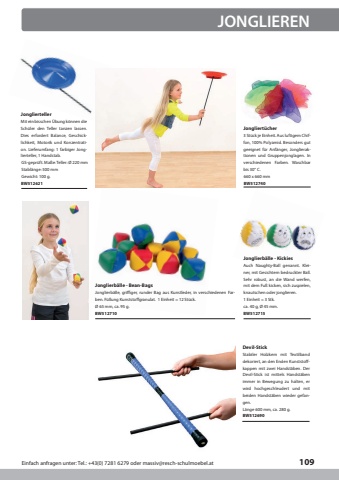Einfach anfragen unter: Tel.: +43(0) 7281 6279 oder massiv@resch-schulmoebel.at109JongliertellerGS-gepr%u00fcft. Ma%u00dfe: Teller: %u00d8 220 mm Stabl%u00e4nge: 500 mmGewicht: 100 g.Mit ein bisschen %u00dcbung k%u00f6nnen die Sch%u00fcler den Teller tanzen lassen. Dies erfordert Balance, Geschicklichkeit, Motorik und Konzentration. Lieferumfang: 1 farbiger Jonglierteller, 1 Handstab.BW512621Devil-StickJonglierb%u00e4lle - Bean-BagsJonglierb%u00e4lle - KickiesL%u00e4nge 600 mm, ca. 280 g.%u00d8 65 mm, ca. 95 g.ca. 40 g, %u00d8 45 mm.Stabiler Holzkern mit Textilband dekoriert, an den Enden Kunststoffkappen mit zwei Handst%u00e4ben. Der Devil-Stick ist mittels Handst%u00e4ben immer in Bewegung zu halten, er wird hochgeschleudert und mit beiden Handst%u00e4ben wieder gefangen.Jonglierb%u00e4lle, griffiger, runder Bag aus Kunstleder, in verschiedenen Farben. F%u00fcllung Kunststoffgranulat. 1 Einheit = 12 St%u00fcck.Auch Naughty-Ball genannt. Kleiner, mit Gesichtern bedruckter Ball. Sehr robust, an die Wand werfen, mit dem Fu%u00df kicken, sich zuspielen, knautschen oder jonglieren.1 Einheit = 3 Stk.BW512690BW512710BW512715Jongliert%u00fccher660 x 660 mm3 St%u00fcck je Einheit. Aus luftigem Chiffon, 100% Polyamid. Besonders gut geeignet f%u00fcr Anf%u00e4nger, Jonglieraktionen und Gruppenjonglagen. In verschiedenen Farben. Waschbar bis 30%u00b0 C.BW512740JONGLIEREN