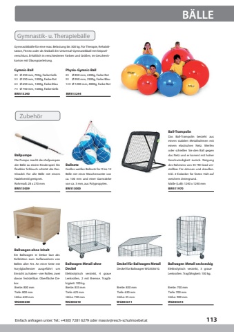 Einfach anfragen unter: Tel.: +43(0) 7281 6279 oder massiv@resch-schulmoebel.at113B%u00c4LLEGymnic-BallPhysio-Gymnic-Ball45%u00d8 450 mm, 700g, Farbe Gelb85%u00d8 850 mm, 2200g, Farbe Rot75%u00d8 750 mm, 1600g, Farbe Gelb55%u00d8 550 mm, 1000g, Farbe Rot95%u00d8 950 mm, 2500g, Farbe Blau65%u00d8 650 mm, 1400g, Farbe Blau120%u00d8 1200 mm, 4000g, Farbe RotGymnastikb%u00e4lle f%u00fcr eine max. Belastung bis 300 kg. F%u00fcr Therapie, Rehabilitation, Fitness oder als Sitzball. Ein Universal-Gymnastikball mit St%u00f6pselverschluss. Erh%u00e4ltlich in verschiedenen Farben und Gr%u00f6%u00dfen, im Geschenkkarton mit %u00dcbungsanleitung.BW513240BW513244Gymnastik- u. Therapieb%u00e4lleBallpumpeBall-TrampolinBallnetzDas Ball-Trampolin besteht aus einem stabilen Metallrahmen mit einem elastischen Netz. Werfen oder schie%u00dfen Sie den Ball gegen das Netz und er kommt mit hoher Geschwindigkeit zur%u00fcck. Neigung des Rahmens von 35%u201390 Grad verstellbar. F%u00fcr drinnen und drau%u00dfen.Inkl. 2 Erdanker f%u00fcr festen Halt auf weichem Untergrund.Ma%u00dfe (LxB): 1240 x 1240 mmGro%u00dfes wei%u00dfes Ballnetz f%u00fcr 9 bis 12 B%u00e4lle mit einer Maschenweite von ca. 100 mm und einer Garnst%u00e4rke von ca. 3 mm, aus Polypropylen.Die Pumpe macht das Aufpumpen der B%u00e4lle zu einem Kinderspiel. Ein flexibler Schlauch sch%u00fctzt die Ventilnadel. F%u00fcr alle B%u00e4lle mit einem Nadelventil geeignet.Rohrma%u00df: 28 x 270 mmBW513009BW513000BW511970Zubeh%u00f6rBallwagen ohne InhaltH%u00f6he: 650 mmTiefe: 800 mmBreite: 800 mmEin Ballwagen in Dekor laut akt. Kollektion zum Aufbewahren von B%u00e4llen aller Art. An einer Seite mit Acrylglasfenster ausgef%u00fchrt um Einsicht zu haben - vier Rollen, zwei davon feststellbar. Oberfl%u00e4che Dekor.WG503600Ballwagen Metall ohne Deckel f%u00fcr Ballwagen MetallDeckelBallwagen Metall sechseckigDeckel f%u00fcr Ballwagen WG503610.Elektrolytisch verzinkt, 4 graue Lenkrollen, 2 mit Bremse. Tragf%u00e4higkeit: 100 kg.Elektrolytisch verzinkt, 3 graue Lenkrollen. Tragf%u00e4higkeit: 100 kg.Breite: 835 mmBreite: 830 mmBreite: 700 mmH%u00f6he: 740 mmH%u00f6he: 35 mmH%u00f6he: 900 mmTiefe: 625 mmTiefe: 630 mmTiefe: 700 mmWG503610WG503611WG503615