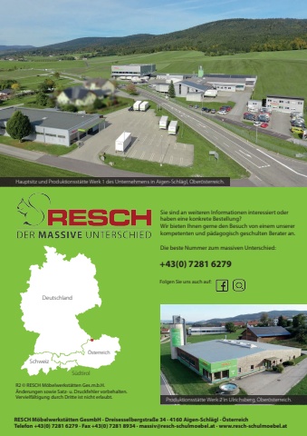 Folgen Sie uns auch auf:RESCH M%u00f6belwerkst%u00e4tten GesmbH %u00b7 Dreisesselbergstra%u00dfe 34 %u00b7 4160 Aigen-Schl%u00e4gl %u00b7 %u00d6sterreich Telefon +43(0) 7281 6279 %u00b7 Fax +43(0) 7281 8934 %u00b7 massiv@resch-schulmoebel.at %u00b7 www.resch-schulmoebel.at Hauptsitz und Produktionsst%u00e4tte Werk 1 des Unternehmens in Aigen-Schl%u00e4gl, Ober%u00f6sterreich.%u00d6sterreichSchweizDeutschlandS%u00fcdtirol.R2 %u00a9 RESCH M%u00f6belwerkst%u00e4tten Ges.m.b.H.%u00c4nderungen sowie Satz- u. Druckfehler vorbehalten.Vervielf%u00e4ltigung durch Dritte ist nicht erlaubt.Sie sind an weiteren Informationen interessiert oder haben eine konkrete Bestellung?Wir bieten Ihnen gerne den Besuch von einem unserer kompetenten und p%u00e4dagogisch geschulten Berater an.Die beste Nummer zum massiven Unterschied:+43(0) 7281 6279Produktionsst%u00e4tte Werk 2 in Ulrichsberg, Ober%u00f6sterreich.