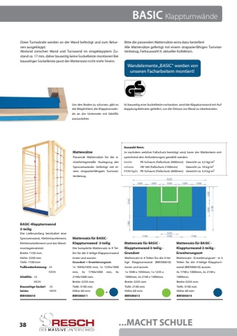38...MACHT SCHULEMattensatz f%u00fcr BASICKlappturnwand 3-teilig BASIC-Klappturnwand 3-teiligDer komplette Mattensatz in 9 Teilen f%u00fcr die 3-teilige Klappturnwand innen und aussen.Grundset + Erweiterungsset.1x 1040x1050 mm, 1x 1235x1000 mm, 3x 1740x1000 mm, 4x 2140x1000 mm.Ist bauseitig eine Sockelleiste vorhanden, wird die Klappturnwand mit Aufdopplungsblenden geliefert, um die Distanz zur Wand zu %u00fcberbr%u00fccken.Um den Boden zu schonen, gibt es die M%u00f6glichkeit, die Klappturnw%u00e4nde an der Unterseite mit Gleitfilz auszustatten.Der Lieferumfang beinhaltet eine Sprossenwand, Klettertauelement, Kletternetzelement und das Wandmontagematerial.BW500610BW500611Breite: 1150 mmTiefe: 1100 mmH%u00f6he: 2230 mmBreite: 5235 mmTiefe: 3140 mmH%u00f6he: 60 mmJAJAJAFu%u00dfbodenheizung:Gleitfilz:Bauseitige Sockelleiste:NEINNEINNEINMattens%u00e4tzeMattensatz f%u00fcr BASIC - Klappturnwand 3-teilig - ErweiterungssetMattensatz f%u00fcr BASIC - Klappturnwand 3-teilig - GrundsetMattensatz in 4 Teilen f%u00fcr die 3-teilige Klappturnwand (BW500610) innen und aussen.Mattensatz - Erweiterungsset - in 5 Teilen f%u00fcr die 3-teilige Klappturnwand (BW500610) aussen.Passende Mattens%u00e4tze f%u00fcr die sicherheitsgem%u00e4%u00dfe Auslegung der Sprossenw%u00e4nde. Gefertigt mit einem strapazierf%u00e4higem Turnmattenbezug.Breite: 3235 mmBreite: 5235 mmTiefe: 2140 mmTiefe: 3140 mmH%u00f6he: 60 mmH%u00f6he: 60 mmBW500613BW5006143x 1740 x 1000mm, 2x 2140 x 1000mm.1x 1040 x 1050mm, 1x 1235 x 1000mm, 2x 2140 x 1000mm.leichtPE-Schaum (Fallschutz 2000mm)schwerVB 160 (Fallschutz 2100mm)Auswahl Kern:FSM/lightPE-Schaum (Fallschutz 2600mm)+Gewicht ca. 3,5 kg/m%u00b2Gewicht ca. 3,4 kg/m%u00b2Gewicht ca. 10 kg/m%u00b2Alle Mattens%u00e4tze gefertigt mit einem strapazierf%u00e4higen Turnmattenbezug, Farbauswahl lt. aktueller Kollektion.Diese Turnw%u00e4nde werden an der Wand befestigt und zum Beturnen ausgeklappt.Abstand zwischen Wand und Turnwand im eingeklapptem Zustand ca. 17 mm, daher bauseitig keine Sockelleiste montieren! Bei bauseitiger Sockelleiste passt der Mattensatz nicht mehr hinein.Bitte die passenden Mattens%u00e4tze extra dazu bestellen!BASIC Klappturnw%u00e4ndeWandelemente %u201eBASIC%u201c werden von unseren Facharbeitern montiert!Je nachdem welcher Fallschutz ben%u00f6tigt wird, kann der Mattenkern entsprechend den Anforderungen gew%u00e4hlt werden: