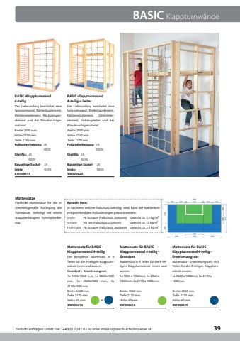 Einfach anfragen unter: Tel.: +43(0) 7281 6279 oder massiv@resch-schulmoebel.at39JAJAJAJAJAJAFu%u00dfbodenheizung:Fu%u00dfbodenheizung:Gleitfilz:Gleitfilz:Bauseitige Sockelleiste:Bauseitige Sockelleiste:NEINNEINNEINNEINNEINNEIN+BASIC-Klappturnwand4-teiligBASIC-Klappturnwand4-teilig + LeiterDer Lieferumfang beinhaltet eine Sprossenwand, Klettertauelement, Kletternetzelement, Reckstangenelement und das Wandmontagematerial.Der Lieferumfang beinhaltet eine Sprossenwand, Klettertauelement, Kletternetzelement, Gitterleiterelement, Einh%u00e4ngeleiter und das Wandmontagematerial.BW500615BW500620Breite: 2000 mmTiefe: 1100 mmH%u00f6he: 2230 mmBreite: 2000 mmTiefe: 1100 mmH%u00f6he: 2230 mmBASIC Klappturnw%u00e4ndeMattensatz f%u00fcr BASIC - Klappturnwand 4-teiligDer komplette Mattensatz in 9 Teilen f%u00fcr die 4-teiligen Klappturnw%u00e4nde innen und aussen.Grundset + Erweiterungsset.1x 1850x1060 mm, 1x 2060x1000 mm, 3x 2020x1000 mm, 4x 2170x1000 mm.BW500616Breite: 6060 mmBreite: 6060 mmTiefe: 3170 mmTiefe: 3170 mmH%u00f6he: 60 mmMattens%u00e4tzeMattensatz f%u00fcr BASIC - Klappturnwand 4-teilig - ErweiterungssetMattensatz f%u00fcr BASIC - Klappturnwand 4-teilig - GrundsetMattensatz in 4 Teilen f%u00fcr die 4-teiligen Klappturnw%u00e4nde innen und aussen.Mattensatz - Erweiterungsset - in 5 Teilen f%u00fcr die 4-teiligen Klappturnw%u00e4nde aussen.Passende Mattens%u00e4tze f%u00fcr die sicherheitsgem%u00e4%u00dfe Auslegung der Turnw%u00e4nde. Gefertigt mit einem strapazierf%u00e4higem Turnmattenbezug.Breite: 4060 mmTiefe: 2170 mmH%u00f6he: 60 mmH%u00f6he: 60 mmBW500618BW5006193x 2020 x 1000mm, 2x 2170 x 1000mm.1x 1850 x 1060mm, 1x 2060 x 1000mm, 2x 2170 x 1000mm.leichtPE-Schaum (Fallschutz 2000mm)schwerVB 160 (Fallschutz 2100mm)Auswahl Kern:FSM/lightPE-Schaum (Fallschutz 2600mm)Gewicht ca. 3,5 kg/m%u00b2Gewicht ca. 3,4 kg/m%u00b2Gewicht ca. 10 kg/m%u00b2Je nachdem welcher Fallschutz ben%u00f6tigt wird, kann der Mattenkern entsprechend den Anforderungen gew%u00e4hlt werden: