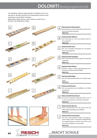 64...MACHT SCHULEBalanciertafel H%u00fcgelBalanciertafel BodenHier sind halbrunde Naturh%u00f6lzer an der Fl%u00e4che angebracht.Hier sind angenehm weiche Stoffb%u00e4lle in die Fl%u00e4che eingearbeitet.Die beidseitig nutzbaren Balanciertafel aus Multiplex sind in Anlehnung an die Natur best%u00fcckt. Die Anbindungen passen auf die Sportboxen und die BASIC-Turnb%u00f6cke.BW501524BW501525BalanciertafelnBalanciertafel ZEH(ner)Balanciertafel SinneBalanciertafel SteinpfadMa%u00dfe jeweils: Breite 240 mm, L%u00e4nge 1900 mm, H%u00f6he 90 mm, Gewicht 7 kg, belastbar bis 100 kg.Hier sind Punkte von 1 bis 10 zum Z%u00e4hlen mit den F%u00fc%u00dfen angebracht. Hier sind verschiedene Materialien f%u00fcr eine Barfu%u00dfErkundung angebracht.Hier sind verschieden hohe bzw. geformte Holzsteine angebracht. BW501528BW501529BW501530ABABCCDDFGIGFBalanciertafel Pf%u00fctzenWechselt zwischen festem Birkensperrholz-Untergrund und weichen Kunststoff-Feldern.BW501535EBalanciertafel KieselstrandDurch die verschiedenen Materialien f%u00fchlt es sich so an, als ob man irgendwo in der Natur heruml%u00e4uft.BW501538HJEHDOLOMITI BewegungslandschaftBalancierbrett H%u00fchnerleiterBeim Balancieren auf der H%u00fchnerleiter wird die LinksRechts-Koordination gef%u00f6rdert.BW501536Balancierbrett SprosseBalancierbrett ColourstepsDurch das Balancieren %u00fcber die Sprossen wird die Fu%u00dfmuskulatur gekr%u00e4ftigt und stabilisiert.Die sechs unterschiedlichen Farben der Balanciersteine bringen neben verschiedenen M%u00f6glichkeiten der Aufgabenstellung innerhalb eines Parcous auch einen frohen Farbklecks in die Turnhalle.BW501537BW501539IJ