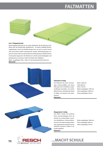 72...MACHT SCHULEBreite: 1200 mmBreite ausgeklappt: 1200 mmBreite ausgeklappt: 1800 mmTiefe: 600 mmTiefe ausgeklappt: 2400 mmTiefe ausgeklappt: 600 mmH%u00f6he: 120 mmH%u00f6he ausgeklappt: 30 mmH%u00f6he ausgeklappt: 50 mmFaltmatte 4-teilig6-in-1 KlappmatratzeKlappmatte 3-teiligDie Faltmatte hat einen hochwertigen Schaumstoffkern, der blaue %u00dcberzug ist ein rutschfester, strapazierf%u00e4higes Kunstleder und mittels Rei%u00dfverschluss abziehbar,die Matte ist faltbar und dadurch sehr platzsparend.Diese klappbare Matratze ist ein echtes Multitalent. Ob als Ruheinsel, Sitzfl%u00e4che oder als fantasievolles Spielelement %u2013 sie bietet unz%u00e4hlige Einsatzm%u00f6glichkeiten. Durch das flexible Design kann sie auch zu einem Tunnel oder einer kleinen H%u00f6hle umfunktioniert werden. Klettverbindungen sorgen f%u00fcr sicheren Halt. Der abwischbare Kunstlederbezug mit Rei%u00dfverschluss ist besonders hygienisch. Die Matratze ist schnell zusammenklappbar und platzsparend zu verstauen. Farbe: Kunstleder 6257 Apfelgr%u00fcn.Ma%u00dfe: ausgeklappt 1950 x 1300 x 75 mm (Einzelmatte 650 x 650 mm)Eine Matte, welche sich jederzeit leicht zusammenklappen l%u00e4sst. Sie besteht aus hochwertigem, rutschund abriebfestem Schaumstoffmaterial und ist zudem hautfreundlich. Inkl. angebrachten Henkel f%u00fcr eineneinfachen Transport. Farben lt. aktueller Kollektion.BW502900BW502902BW502901FALTMATTEN