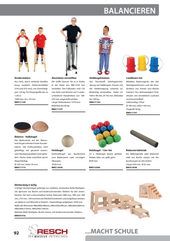 92...MACHT SCHULEBALANCIERENBW501516Klettersteig 5-teilig5-teilige Hockertreppe gefertigt aus stabilem, lackiertem Birke-Multiplex, mit Sprossen aus Buche und bodenschonenden Gleitern f%u00fcr den Innenbereich. Die f%u00fcnf unterschiedlich hohen Elemente (480 mm, 390 mm, 300 mm, 210 mm, 120 mm) k%u00f6nnen flexibel kombiniert und aufgebaut werden, um Balance und Motorik zu f%u00f6rdern.%u00a0 Gesamtl%u00e4nge aufgebaut: 2330 mm.Ma%u00dfe der Elemente: 480x480x480mm, 480x420x390mm, 480x360x300mm, 480x300x210mm, 480x240x120mm.Material: Birke Multiplex, Buche massiv, mit bodenschonenden Gleitern.KinderstelzenAlustelzen verstellbarHalbkugelstelzenLaufdosen SetBelastbar bis 60 kg.1400 mm, 35 x 35 mm%u00d8 100 mm, H%u00f6he 120 mm, Tragkraft 50 kgDie Griffe k%u00f6nnen Sie in 8 Stufen in der H%u00f6he von 980-1570 mm verstellen. Die Fu%u00dfrasten sind 125 mm breit und k%u00f6nnen auf 3 unterschiedliche Standh%u00f6hen von 160-270 mm eingestellt werden.L%u00e4nge Stelzenbeine: 1570 mmAus Holz, durch einfache Handhabung zweifach h%u00f6henverstellbar (310 und 410 mm), mit Gummikappen. 3,8 kg. F%u00fcr K%u00f6rpergr%u00f6%u00dfe bis ca. 1,50 m.Aus Kunststoff, Gleichgewichts%u00fcbung auf Halbkugeln. Passen sich der Gehbewegung nat%u00fcrlich an. Beidseitig verwendbar. Farbe: rot. H%u00f6he: 80 mm, %u00d8 150 mm. Belastbar bis 100 kg. Beliebtes Balanceger%u00e4t, das den Gleichgewichtssinn und die Koordination von Armen und Beinen trainiert. Aus dickwandigem Polyethylen mit verst%u00e4rktem Laufrand und Kunststoffseil.Lieferumfag: 3 PaarBW511157BW511152BW511151BW511155HolzkugelBalanciertaktstab %u00d8 50 mmL%u00e4nge 220 mm, %u00d8 25 mmHartholzkugel aus Buchenholz zum Balancieren oder sonstigen %u00dcbungen.Ein Balltragestab oder Balancierstab aus Buche massiv mit Einbuchtungen an den Enden.BW512545BW512540Balance - Halbkugel%u00d8 140 mm, H%u00f6he 70 mmDas Balancieren auf der Massivholz-Kugel erfordert hohe Konzentration. Die Fu%u00dfmuskulatur wird gekr%u00e4ftigt, der gesamte motorische Bewegungsablauf wird gef%u00f6rdert. Flache Seite rutschfest durch Teppichbelag.BW511113Holzkugel - 12er Set%u00d8 60 mm12 x Holzkugel Buche gebeizt.Farben: blau, rot, gelb, gr%u00fcn. BW512546