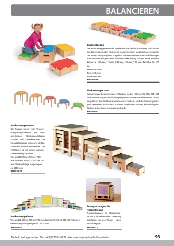 Einfach anfragen unter: Tel.: +43(0) 7281 6279 oder massiv@resch-schulmoebel.at93BALANCIERENHockertreppe buntTransportwagen f%u00fcr HockertreppeVon gro%u00df B 650 x L 550 x H 700 mm bis klein B 450 x L 200 x H 150 mm / Gesamtl%u00e4nge ausgezogen ca. 5000 mmTransportwagen f%u00fcr Hockertreppe mit 4 Schwenkrollen. Lieferung beinhaltet nur den Wagen - ohne Hockertreppe.BW501511BW501512Hockertreppe naturVon gro%u00df B 650 x L 550 x H 700 mm bis klein B 450 x L 200 x H 150 mm / Gesamtl%u00e4nge ausgezogen ca. 5000 mmDie Treppe bietet viele Verwendungsm%u00f6glichkeiten, wie Treppensteigen, Gleichgewichtssinn schulen und Tunnelkriechen. Die Einzelteile lassen sich auch als Hocker bzw. Podeste verwenden. Die Trittfl%u00e4che ist mit einem rutschsicherem Belag versehen.BW501510BalancetreppeHockertreppe rundDie Balancetreppe vermittelt spielerisch das Gef%u00fchl von H%u00f6hen und Distanzen. Durch die gro%u00dfen Fl%u00e4chen ist ein sicheres Auf- und Absteigen m%u00f6glich. Die Kisten sind passgenau stapelbar und besitzen seitliche Griff%u00f6ffnungen zum leichten Transportieren. Material: Birke, farbig lackiert. H%u00f6he einzelne Kisten: ca. 100 mm, 115 mm, 135 mm, 155 mm, 175 mm. Belastbar bis 100 kg.Hockertreppe bestehend aus 5 Hockern in den H%u00f6hen 100, 150, 200, 250 und 300 mm. Eignet sich als Sitzgelegenheit sowie zum Balancieren. Durch Vergr%u00f6%u00dfern der Abst%u00e4nde zwischen den Hockern wird der Schwierigkeitsgrad ver%u00e4ndert. Sitzfl%u00e4che %u00d8 250 mm. Oberfl%u00e4che lackiert, Birke Multiplex. Farben: gr%u00fcn, blau, rot, orange und gelb.BW501509BW501507Breite: 440 mmTiefe: 310 mmH%u00f6he: 660 mm