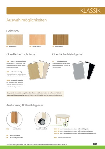 Einfach anfragen unter: Tel.: +43(0) 7281 6279 oder massiv@resch-kindermoebel.at101Ausf%u00fchrung Rollen/FilzgleiterHolzartenMHGMassivholz gewachstDetail FeststellrolleLINmit LinoleumbelagROLL%u00fcberall FeststellrollenSSBmit HPL SchichtstoffbelagFILZmit FilzgleiterAuswahlm%u00f6glichkeitenHochwertiger HPL Schichtstoff in unterschiedlichen Farben und Dekoren, f%u00fcr hohe Beanspruchung geeignet.Widerstandsf%u00e4hige und ger%u00e4uschd%u00e4mmende Oberfl%u00e4che in unterschiedlichen Farben.F%u00fcr besonders hohe %u00f6kologische Anspr%u00fcche stellen wir unsere Tische auch in Massivholz gewachst her.BIBirke massivBUBuche massivEIEiche massivKLASSIKOberfl%u00e4che TischplatteOberfl%u00e4che MetallgestellPVpulverbeschichtet Die gesamte Auswahl der m%u00f6glichen Oberfl%u00e4chen und Farben finden Sie auf unserer Website www.resch-kindermoebel.at unter %u201eFARBEN U. MATERIALIEN%u201c oder bei unseren Fachberatern.Unsere Metallgestelle werden pulverbeschichtet ausgef%u00fchrt, in Farben der aktuellen Kollektion.KUKFKunststoffgleiterKunststoffgleiter + Filz2ROL-FZ2ROL-KU2ROL-KFmit 2 Feststellrollen, restliche F%u00fc%u00dfe mit Filzgleitermit 2 Feststellrollen, restliche F%u00fc%u00dfe mit Kunststoffgleitermit 2 Feststellrollen, restliche F%u00fc%u00dfe mit Kunststoffgleiter + Filz