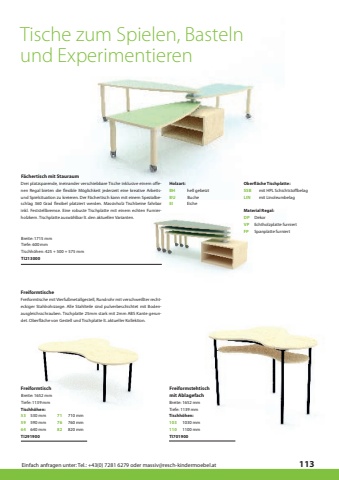 Einfach anfragen unter: Tel.: +43(0) 7281 6279 oder massiv@resch-kindermoebel.at113F%u00e4chertisch mit StauraumFreiformtischFreiformstehtisch mit AblagefachFreiformtischeTI213000TI291900TI701900Drei platzsparende, ineinander verschiebbare Tische inklusive einem offenen Regal bieten die flexible M%u00f6glichkeit jederzeit eine kreative Arbeitsund Spielsituation zu kreieren. Der F%u00e4chertisch kann mit einem Spezialbeschlag 360 Grad flexibel platziert werden. Massivholz Tischbeine fahrbar inkl. Feststellbremse. Eine robuste Tischplatte mit einem echten Furnierholzkern. Tischplatte ausw%u00e4hlbar lt. den aktuellen Varianten.Freiformtische mit Vierfu%u00dfmetallgestell, Rundrohr mit verschwei%u00dfter rechteckiger Stahlrohrzarge. Alle Stahlteile sind pulverbeschichtet mit Bodenausgleichsschrauben. Tischplatte 25mm stark mit 2mm ABS Kante gerundet. Oberfl%u00e4che von Gestell und Tischplatte lt. aktueller Kollektion.Breite: 1715 mmBreite: 1652 mmBreite: 1652 mmTiefe: 600 mmTiefe: 1139 mmTiefe: 1139 mmTischh%u00f6hen: 425 + 500 + 575 mmHolzart:Oberfl%u00e4che Tischplatte:Tischh%u00f6hen:Tischh%u00f6hen:LINmit LinoleumbelagSSBmit HPL SchichtstoffbelagBUBHEIBuchehell gebeiztEicheDPVPFPDekorEchtholzplatte furniertSpanplatte furniertMaterial Regal:Tische zum Spielen, Bastelnund Experimentieren53530 mm8211059590 mm766410371640 mm1030 mm710 mm820 mm1100 mm760 mm