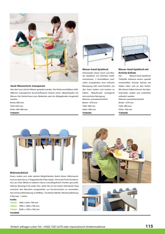 Einfach anfragen unter: Tel.: +43(0) 7281 6279 oder massiv@resch-kindermoebel.at115Gr%u00f6%u00dfe:3Sitzer5Sitzer7Sitzer1600 x 650 x 760 mm1900 x 1000 x 760 mm2500 x 1250 x 760 mmSand-/Wassertisch, transparentBreite: 890 mmTI206281Tiefe: 630 mmH%u00f6he: 440-580 mmHier darf und soll mit Wasser gespielt werden. Die h%u00f6henverstellbare (440-580mm) transparente Kunststoffwanne besitzt einen Ablaufstopfen f%u00fcr Wasser. Der Deckel kann zum Abdecken oder als Ablageboden eingesetzt werden.Wasser-Sand-SpieltischMehrzwecktischWasser-Sand-Spieltisch mit Activity AufsatzBreite: 1270 mmRahmen: pulverbeschichtetRahmen: pulverbeschichtetBreite: 1270 mmTI206285TI220000TI206286Tiefe: 580 mmTiefe: 580 mmH%u00f6he: 580 mmH%u00f6he: 760 mmUltrastarker, klarer Sand und Wasser Spieltisch mit leichtem Stahlrohrrahmen. 2 feststellbare Laufrollen erm%u00f6glichen eine einfache Bewegung. Inkl. zwei Deckeln, um den Sand sauber und trocken zu halten. Ablaufventil erm%u00f6glicht eine einfache Reinigung.Essen, malen und viele weitere M%u00f6glichkeiten bietet dieser Mehrzwecktisch an dem bis zu 7 Krippenkinder Platz haben. Die Stuhl/Tisch-Kombination aus Holz (Birke) ist %u00e4u%u00dferst robust und pflegeleicht. Kanten gerundet. Inklusiv Bauchgurt f%u00fcr jeden Sitz. Jeder Sitz ist mit einem Sicherheits-Steg zwischen den Beinchen ausgestattet, um Durchrutschen zu vermeiden. Sitz mit Kunstlederbezug in Hellblau. Tischbeine Metall. Altersempfehlung: 6 Monate - 2 Jahre.Der Wasser-Sand-Spieltisch TI206285 inklusive einem speziell entwickelten Activity Aufsatz mit Haken oben und an den Seiten. Mit diesen Haken k%u00f6nnen die Spielutensilien sauber und ordentlich aufwahrt werden.