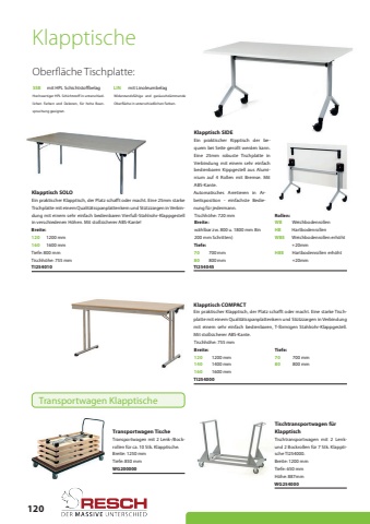 120Klapptisch COMPACTTischtransportwagen f%u00fcr KlapptischKlapptisch SOLOBreite: 1200 mm120WB120701200 mm70Weichbodenrollen1200 mm700 mm700 mmTI254000WG254000TI254010Tiefe: 650 mmTiefe: 800 mm140HB1400 mm80Hartbodenrollen800 mmTischh%u00f6he: 755 mmH%u00f6he: 887mm160WBEHBE160801600 mmWeichbodenrollen erh%u00f6ht +20mmHartbodenrollen erh%u00f6ht +20mm1600 mm800 mmEin praktischer Klapptisch, der Platz schafft oder macht. Eine starke Tischplatte mit einem Qualit%u00e4tsspanplattenkern und St%u00fctzzargen in Verbindung mit einem sehr einfach bedienbaren, T-f%u00f6rmigen Stahlrohr-Klappgestell. Mit sto%u00dfsicherer ABS-Kante.Tischtransportwagen mit 2 Lenkund 2 Bockrollen f%u00fcr 7 Stk. Klapptische TI254000.Ein praktischer Klapptisch, der Platz schafft oder macht. Eine 25mm starke Tischplatte mit einem Qualit%u00e4tsspanplattenkern und St%u00fctzzargen in Verbindung mit einem sehr einfach bedienbaren Vierfu%u00df-Stahlrohr-Klappgestell in verschiedenen H%u00f6hen. Mit sto%u00dfsicherer ABS-Kante!Oberfl%u00e4che Tischplatte:SSBmit HPL SchichtstoffbelagLINmit LinoleumbelagHochwertiger HPL Schichtstoff in unterschiedlichen Farben und Dekoren, f%u00fcr hohe Beanspruchung geeignet.Widerstandsf%u00e4hige und ger%u00e4uschd%u00e4mmende Oberfl%u00e4che in unterschiedlichen Farben.KlapptischeBreite:Rollen:Breite:Breite:Tiefe:Tiefe:Transportwagen mit 2 Lenk-/Bockrollen f%u00fcr ca. 10 Stk. Klapptische.Transportwagen TischeBreite: 1250 mmWG200000Tiefe: 850 mmKlapptisch SIDEw%u00e4hlbar zw. 800 u. 1800 mm 8in 200 mm Schritten)TI254045Tischh%u00f6he: 720 mmEin praktischer Kipptisch der bequem bei Seite gerollt werden kann. Eine 25mm robuste Tischplatte in Verbindung mit einem sehr einfach bedienbaren Kippgestell aus Aluminium auf 4 Rollen mit Bremse. Mit ABS-Kante.Automatisches Arretieren in Arbeitsposition - einfachste Bedienung f%u00fcr jedermann.Transportwagen KlapptischeTischh%u00f6he: 755 mm