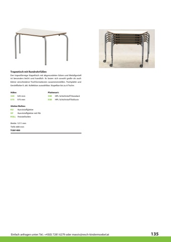 Einfach anfragen unter: Tel.: +43(0) 7281 6279 oder massiv@resch-kindermoebel.at135Trapeztisch mit Rundrohrf%u00fc%u00dfenBreite: 1211 mmTI281400Tiefe: 600 mmDer trapezf%u00f6rmige Stapeltisch mit abgerundeten Ecken und Metallgestell ist besonders leicht und handlich. Es lassen sich sowohl gro%u00dfe als auch kleine verschiedene Tischformationen zusammenstellen. Tischplatte und Gestellfarbe lt. akt. Kollektion ausw%u00e4hlbar. Stapelbar bis zu 6 Tische.H%u00f6he:Gleiter/Rollen:Plattenart:575ESB525SSB575 mmHPL Schichtstoff Exklusiv525 mmHPL Schichtstoff StandardROLLFeststellrollenKFKUKunststoffgleiter mit FilzKunststoffgleiter