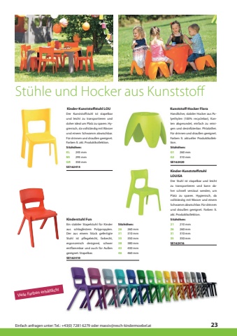 Einfach anfragen unter: Tel.: +43(0) 7281 6279 oder massiv@resch-kindermoebel.at23St%u00fchle und Hocker aus KunststoffKinder-Kunststoffstuhl LOUKunststoff-Hocker FloraKinder-Kunststoffstuhl LOUISASE162415SE162420SE162416Der Kunststoffstuhl ist stapelbar und leicht zu transportieren und daher ideal um Platz zu sparen. Hygienisch, da vollst%u00e4ndig mit Wasser und einem Schwamm abwischbar. F%u00fcr drinnen und drau%u00dfen geeignet. Farben lt. akt. Produktkollektion.Handlicher, stabiler Hocker aus Polyethylen (100% recyclebar), Kanten abgerundet, einfach zu reinigen und desinfizierbar. Phtalatfrei. F%u00fcr drinnen und drau%u00dfen geeignet. Farben lt. aktueller Produktkollektion.Der Stuhl ist stapelbar und leicht zu transportieren und kann daher schnell verstaut werden, um Platz zu sparen. Hygienisch, da vollst%u00e4ndig mit Wasser und einem Schwamm abwischbar. F%u00fcr drinnen und drau%u00dfen geeignet. Farben lt. akt. Produktkollektion.Kinderstuhl FunSE162410Ein stabiler Stapelstuhl f%u00fcr Kinder aus schlagfestem Polypropylen. Der aus einem St%u00fcck gefertigte Stuhl ist pflegeleicht, farbecht, ergonomisch designed, schwer entflammbar und auch f%u00fcr Au%u00dfen geeignet. Stapelbar.Sitzh%u00f6hen:Sitzh%u00f6hen:Sitzh%u00f6hen:Sitzh%u00f6hen:38262621KLG1463535GR433131MIG2380 mm260 mm260 mm210 mm245 mm260 mm460 mm350 mm350 mm350 mm430 mm310 mm310 mm295 mm310 mmViele Farben erh%u00e4ltlich!