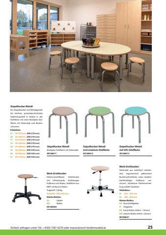 Einfach anfragen unter: Tel.: +43(0) 7281 6279 oder massiv@resch-kindermoebel.at25Werk-DrehhockerWerk-DrehhockerSE160630SE160631GLKURHROFIRWGleiterKunststoffgleiterharte Rollen (H%u00f6he + 25mm)RollenFilzgleiterweiche Rollen (H%u00f6he +25mm)H%u00f6henverstellbarer Drehhocker mit Liftmechanik, f%u00fcnfarmiges Fu%u00dfkreuz mit Rollen, Sitzfl%u00e4che aus MDF mit Buche-Dekor.Tragkraft: 120 kg.Sitzschale aus mehrfach verleimtem, ergonomisch geformtem Buchenschichtholz, natur lackiert. F%u00fcnfstrahliges Fu%u00dfkreuz verchromt. Stufenlose H%u00f6henverstellung mittels Gasfeder.Gleiter/Rollen:Gleiter/Rollen:Sitzh%u00f6he: 380-530 mm(DM 270 mm)(DM 270 mm)(DM 270 mm)(DM 270 mm)(DM 270 mm)(DM 350 mm)(DM 350 mm)(DM 350 mm)Stapelhocker Metallmit Linoleum-Sitzfl%u00e4cheStapelhocker MetallStapelhocker MetallStapelhocker Metall mit HPL-Sitzfl%u00e4cheSE160611SE160612SE160613Ein Stapelhocker mit Metallgestell. Ein leichtes, pulverbeschichtetes Stahlrohrgestell in Farben lt. akt. Kollektion mit einer Multiplex Sitzfl%u00e4che mit Sitzmulde und Bodenschonern.Multiplex Sitzfl%u00e4che mit Sitzmulde.3826XL21MSH 380mmSH 260mm380 - 508 mmSH 210mm355 - 443 mm465135SH 460mmSH 510mmSH 350mm4331SH 430mmSH 310mmSitzh%u00f6hen:Sitzh%u00f6hen: