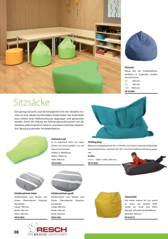 38SitzsackSitzsack LeafSE161800SE161850Bezug laut akt. Textilkollektion. Erh%u00e4ltlich in folgenden Gr%u00f6%u00dfen (Durchmesser):Er ist eigentlich mehr ein Liegekissen und somit perfekt, um sich lang auszustrecken.Farben lt. Abbildung.7010050700 mm1000 mm500 mmSitzw%u00fcrfelSE161810Die etwas andere Art um weich zu sitzen. Ein leichter Stoffw%u00fcrfel f%u00fcr Gro%u00df und Klein.Bezug lt. aktueller Textilkollektion.Sitzh%u00f6he: 400 mmSitzs%u00e4ckeChilling BagSE161830Bequeme Sitzgelegenheit f%u00fcr 2-4 Kinder, mit extrem robuster Au%u00dfenh%u00fclle (wasserabweisend, waschbar bei 30%u00b0). Auch f%u00fcr Au%u00dfenanwendung geeignet.1300 x 1700 x 300 mmGr%u00f6%u00dfe:380LTDas geringe Gewicht und die bewegliche Form der Sitzs%u00e4cke machen sie zum idealen komfortablen Kinderm%u00f6bel. Die Au%u00dfenh%u00fclle kann mittels eines Rei%u00dfverschlusses abgezogen und gewaschen werden. Durch die F%u00fcllung aus Polystyrolgranulat passen sich die Sitzs%u00e4cke jeder K%u00f6rperform ideal an und bieten h%u00f6chsten Sitzkomfort. Bezug laut aktueller Produktkollektion.Tiefe: 900 mmBreite: 1460 mmSitzkieselstein kleinSitzkieselstein gro%u00dfL%u00e4nge: 700 mmL%u00e4nge: 800 mmBreite: 560 mmBreite: 700 mmSitzkieselstein zum Spielen und Sitzen. Obermaterial: Polyester, Kunstleder. Sitzkieselstein zum Spielen und Sitzen. Obermaterial: Polyester, Kunstleder.H%u00f6he: 250 mmH%u00f6he: 350 mmSE161854SE161855