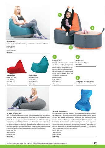 Einfach anfragen unter: Tel.: +43(0) 7281 6279 oder massiv@resch-kindermoebel.at39Lang ausgestreckt liegt bzw. sitzt man auf einem Riesenkissen, auf die Spitze gestellt wie in einem gem%u00fctlichen Sessel. Setzt man sich auf den Pouf, passt sich die homogen verschiebende Granulat- und EPS-Perlen-F%u00fcllung an den K%u00f6rper an, bildet automatisch eine R%u00fcckenlehne und entlastet somit die Wirbels%u00e4ule. Um die H%u00e4rte des Sacks selbst zu bestimmen oder zu Reinigungszwecken kann die F%u00fcllung per Rei%u00dfverschluss aus dem Bezug entnommen werden. Material Bezug: 84% Polyester, 16% Elasthan.Boden mit Kunstlederbeschichtung zum Schutz vor Abrieb und Wasser.Sitzsack mit R%u00fcckenlehne, durch die F%u00fcllung aus Polystyrolgranulat passen sich die Sitzs%u00e4cke jeder K%u00f6rperform ideal an und bieten h%u00f6chsten Sitzkomfort. Trotz seiner Gr%u00f6%u00dfe ist der Sitzsack extrem leicht und Sitbag Lazydaher leicht zu bewegen.Sitzsack AkoHocker AkoTischplatte f%u00fcr Hocker AkoSE161831SE161844SE161845SE161846Tiefe: 1100 mmTiefe: 1000 mmBreite: 1250 mmBreite: 650 mmDurchmesser: 800 mmH%u00f6he: 900 mmH%u00f6he: 880 mmSitbag FunSitzsack MaoSitzsack Spandi LongSE161839SE161841SE161843Tiefe: 800 mmTiefe: 500 mmTiefe: 500 mmBreite: 800 mmBreite: 500 mmBreite: 1100 mmH%u00f6he: 850 mmH%u00f6he: 1200 mmH%u00f6he: 500 mm112323Sitzsack L%u00fcmmelmaxBreite: 1250 mmTiefe: 650 mmOb zum Chillen, Lesen oder Spielen %u2013 auf diesem gem%u00fctlichen Sitzsack findet jeder seine Lieblingsposition. Der strapazierf%u00e4hige Bezug h%u00e4lt einiges aus und l%u00e4sst sich bei Bedarf einfach abnehmen und waschen. Dank der leichten, formbaren F%u00fcllung im Inlett passt sich der Sitzsack optimal an und l%u00e4sst sich im Handumdrehen vom flachen Liegekissen in einen bequemen Sessel oder Hocker verwandeln. Der praktische Tragegriff macht das Mitnehmen ganz einfach. Material: Outdoorstoff, F%u00fcllung EPS-Perlen, Ma%u00dfe: 1250 x 650 x H260 mm, Alter: ab 3 Jahren.H%u00f6he: 260 mmSE161851