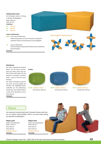 Einfach anfragen unter: Tel.: +43(0) 7281 6279 oder massiv@resch-kindermoebel.at43Wipper gro%u00dfWipper kleinSE163950Sitzh%u00f6he: 330 mmH%u00f6he: 670 mmTiefe: 240 mmBreite: 790 mmSE163951Der ultimative Schaukel-Spiel-Spa%u00df. Schaukeln, Relaxen oder Spielen. Ein stabiler Schaumstoffkern (4072), mit einem festen Bezug laut aktueller Textilkollektion.Sitzh%u00f6he: 360 mmH%u00f6he: 800 mmTiefe: 360 mmBreite: 1100 mmBoden mit Holzformteil.Boden mit Hartfaserplatte.Polsterhocker LibraBreite: 1026 mmSE163932Tiefe: 652 mmEin f%u00fcnfeckiger Hocker mit Bezug lt. aktueller Textilkollektion.Schwer entflammbar:JANEINschwer entflammbarnicht schwer entflammbarVollschaumk%u00f6rper, Bezug mittels Rei%u00dfverschluss abnehmbar, Antirutschbodenstabiler Styroporkern mit 50 mm Sitzschaum, Bezug fest verpolstert. Boden mit Holz bespannt, KunststoffgleiterSitzh%u00f6hen:354538350 mm450 mm380 mmWipperViele m%u00f6gliche Stellvarianten!SS120SS140Sitzh%u00f6he: 180 mmSS150Durchmesser: 350 mmSitzh%u00f6he: 380 mmDurchmesser: 420 mmSitzh%u00f6he: 120 mmDurchmesser: 300 mmMit seiner angenehmen Passform eignet sich das Kissen hervorragend zum Knien, Sitzen oder Hocken. Ebenso ideal eignet sich das Sitzkissen zum Relaxen und Wohlf%u00fchlen %u2013 ganz im Sinne der neuen Sitzkultur.Der %u00e4u%u00dfere Kissenbezug zeichnet sich durch die hohe Qualit%u00e4t des robusten und saugf%u00e4higen%u00a0 Baumwollstoffes aus. Der Au%u00dfenbezug verf%u00fcgt %u00fcber einen Rei%u00dfverschluss, so dass Sie ihn%u00a0abnehmen%u00a0und%u00a0waschen%u00a0k%u00f6nnen.RelaxkissenTX403655Gr%u00f6%u00dfen: