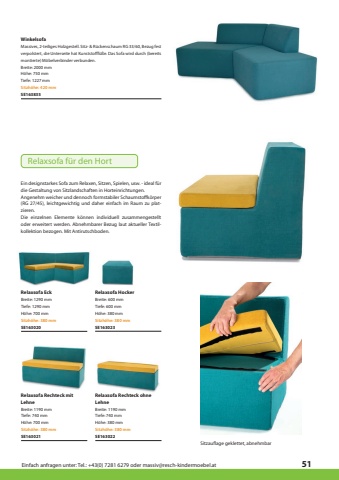 Einfach anfragen unter: Tel.: +43(0) 7281 6279 oder massiv@resch-kindermoebel.at51Relaxsofa EckRelaxsofa HockerRelaxsofa Rechteck mit LehneRelaxsofa Rechteck ohne LehneBreite: 600 mmSE163020SE163023SE163021SE163022Tiefe: 600 mmH%u00f6he: 380 mmSitzh%u00f6he: 380 mmDie einzelnen Elemente k%u00f6nnen individuell zusammengestellt oder erweitert werden. Abnehmbarer Bezug laut aktueller Textilkollektion bezogen. Mit Antirutschboden.Sitzauflage geklettet, abnehmbarEin designstarkes Sofa zum Relaxen, Sitzen, Spielen, usw. - ideal f%u00fcr die Gestaltung von Sitzlandschaften in Horteinrichtungen.Angenehm weicher und dennoch formstabiler Schaumstoffk%u00f6rper (RG 27/45), leichtgewichtig und daher einfach im Raum zu platzieren.Sitzh%u00f6he: 380 mmH%u00f6he: 700 mmTiefe: 1290 mmBreite: 1290 mmSitzh%u00f6he: 380 mmH%u00f6he: 700 mmTiefe: 740 mmBreite: 1190 mmSitzh%u00f6he: 380 mmH%u00f6he: 380 mmTiefe: 740 mmBreite: 1190 mmRelaxsofa f%u00fcr den HortSitzh%u00f6he: 420 mmWinkelsofaMassives, 2-teiliges Holzgestell. Sitz- & R%u00fcckenschaum RG 33/60, Bezug fest verpolstert, die Unterseite hat Kunststofff%u00fc%u00dfe. Das Sofa wird durch (bereits montierte) M%u00f6belverbinder verbunden.Breite: 2000 mmSE163835Tiefe: 1227 mmH%u00f6he: 750 mm