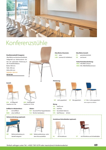Einfach anfragen unter: Tel.: +43(0) 7281 6279 oder massiv@resch-kindermoebel.at69Konferenzstuhl CongressBreite: 500 mmSE7037604FG4-Fu%u00dfgestellH%u00f6he: 845 mmSPSitz gepolstertLPNicht m%u00f6glich bei Griffloch!Sitz + Lehne gepolstertTiefe: 490 mmNPnicht gepolstertINTAZBKFGKufengestellSitzh%u00f6he: 450 mmReihenverbindung im Gestell integriertReihenverbindung unter dem Sitz ausziehbarPolsterung:Reihenverbindung (optional):Gestell:Oberfl%u00e4che aus Buchenschichtholz, Fu%u00dfgestell aus Stahlrundrohr. Farben der optionalen Polsterung lt. akt. Produktkollektion.Konferenzst%u00fchleFLZFilz (f%u00fcr Hartb%u00f6den)KSTKunststoff (f%u00fcr Teppichb%u00f6den)Gleiter:Armlehnen/Schreibtablar (optional):ALmit ArmlehnenSTmit Armlehne und SchreibtablarNEINohne GrifflochJAmit GrifflochGriffloch in R%u00fcckenlehne:BezugKLVSTLSTESTXKunstleder Valencia(B1Q1)Stoff LuciaStoff EraStoff XtremeOberfl%u00e4che Sitzschale:Oberfl%u00e4che Gestell:LAMCRNATPVLaminat (lt. Kollektion)verchromtnaturpulverbeschichtetStapelbar bis 4 Stk.Stapelbar bis 10 Stk.Farbe Pulverbeschichtung:90069005RAL 9006 Wei%u00dfaluminiumRAL9005 schwarz