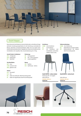 70Stuhl VAPPA - Lehne niederStuhl VAPPA - Lehne hochSE703758SE703759H%u00f6he: 830 mmPolsterung: NP + LP m%u00f6glichH%u00f6he: 905 mmDieser klassische Stuhl bietet mit seinem funktionalen und zeitlosen Design zahlreiche Gestaltungsm%u00f6glichkeiten f%u00fcr die Einrichtung verschiedenster R%u00e4ume. Sitzschale aus Buchenschichtholz, St%u00e4rke 10,5 mm, Buche natur, Gestell Stahl pulverbeschichtet. Stapelbar bis 6 St%u00fcck (mit Armlehnen bzw. Schreibtablar nicht stapelbar). Max. Gewichtsbelastung: bis 110 kg.LAMBEIZLaminat lt. Koll.gebeizt lt. Koll.NATnaturSitz Oberfl%u00e4che:BezugSTESTX(B1Q1)Stoff EraStoff XtremeSPLPSitz + Lehne gepolstertrundum gepolstertNPnicht gepolstertGestell (Farbe lt. Kollektion)Polsterung:4FGKFGDS4-Fu%u00dfgestellKufengestellDrehstuhlStuhl VappaSitzh%u00f6he: 485 mmSitzh%u00f6he: 485 mmFLZFilzKSTKunststoffGleiter:RTRHRollen f%u00fcr Hartboden (NICHT bei Kufengestell)Rollen f%u00fcr Teppichboden (NICHT bei Kufengestell)Armlehnen:ALSTmit Armlehnenmit Armlehnen und Schreibtablar (rechts/links w%u00e4hlbar, Farbe lt. Koll.)OHNEohne ArmlehnenOHNEohne VerbindungRKRVReihenklemme (einzelne St%u00fchle)Reihenverbinder (f%u00fcr Reihen)(NICHT bei Kufengestell)Reihenverbindung: