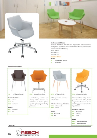 86Konferenzstuhl AkaioBreite: 660 mmSE703762H%u00f6he: 845 mmTiefe: 580 mmSitzh%u00f6he: 470 mmStuhl mit Armlehnen, Sitzschale aus Polypropylen und Formschaum, durchgehend gepolsterter Sitz und R%u00fcckenlehne. Montage-Elemente des Sessels verdeckt von Polsterung. BezugAusf%u00fchrungsvarianten:STFI4L4-Fu%u00dfgestell MetallST46LWM4-Fu%u00dfgestell HolzST334-Arm-Fu%u00dfkreuz, Gestell verchromt, Stuhl drehbar und r%u00fcckstellend in Position (Memoryfunktion), Gelenkgleiter f%u00fcr Teppichb%u00f6den.H%u00f6henverstellbarer Sitz, 5-armiges Fu%u00dfkreuz mit Rollen, Gestell aus poliertem Aluminium. 50 mm lastabh%u00e4ngig gebremste Rollen f%u00fcr Teppichb%u00f6den.Holzkomponenten aus natur lackierter Eiche.Stoff Xtreme (B1Q1)Filz BlazerDrehstuhl mit GleiterDrehstuhl mit RollenFLZFLZ9005WECHRFilzFilzschwarzwei%u00dfverchromtKSTKST9016SWSWHROLALUALPWROLKunststoffKunststoffverkehrswei%u00dfschwarzschwarzHartbodenrollenAluAlu poliertWeichbodenrollenGleiter:Gleiter:Pulverbeschichtung Metallteile:Gestell Oberfl%u00e4che:Oberfl%u00e4che Fu%u00dfkreuz:Rollen:
