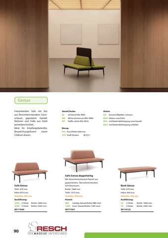 90Sofa GenuaSofa Genua doppelseitigBank GenuaSE717020Sitzh%u00f6he: 450 mmSitzh%u00f6he: 450 mmSitzh%u00f6he: 450 mmH%u00f6he: 815 mmH%u00f6he: 450 mmTiefe: 670 mmTiefe: 670 mmBreite: 1660 mmBreite: 1660 mmBreite: 2365 mmBreite: 2365 mmSE717021SE716122Freistehendes Sofa mit Sitz aus flammhemmendem Formschaum, gepolstert. Gestell: Rahmen und F%u00fc%u00dfe aus Stahl pulverbeschichtet.Ideal f%u00fcr Empfangsbereiche, Besprechungsr%u00e4ume sowie Chillout-Zonen.Mit Zwischenr%u00fcckwand-Paneel aus gepolstertem, flammhemmendem Schnittschaum.Tiefe: 1375 mmBreite: 1660 mmGenuaKLVGD2SOL8802SGDN3SOL12053SSTXGDGGDSBezug:GleiterAusf%u00fchrung:Paneel:Ausf%u00fchrung:Kunstleder ValenciaKunststoffgleiter schwarz2-Sitzerniedrig (Gesamth%u00f6he 880 mm)2-Sitzerhoch (Gesamth%u00f6he 1205 mm)Gleiter rutschfest3-Sitzer3-Sitzermit Bodenbefestigung verschraubtmit Bodenbefestigung verklebtStoff XtremeWKWTWhite aluminium RAL 9006Traffic white RAL 9016BLJet black RAL 9005Gestell Farbe:(B1Q1)