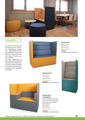Einfach anfragen unter: Tel.: +43(0) 7281 6279 oder massiv@resch-kindermoebel.at91Die Elevation Sitzm%u00f6bel schaffen R%u00fcckzugsorte f%u00fcr ungest%u00f6rtes, konzentriertes Arbeiten oder Kommunikationsinseln, die aufdringliche Umgebungsger%u00e4usche, insbesondere Stimmen anderer Personen, deutlich reduzieren.Die hohe Sitzposition, ein leicht ergonomisch geformtes R%u00fcckenteil sowie die gepolsterten hohen Seitenw%u00e4nde bieten viel Komfort und beste Voraussetzungen f%u00fcr eine angenehme Atmosph%u00e4re. Elevation SesselElevation SofaElevation Sofa mit AblagefachBreite: 700 mmBreite: 1320 mmBreite: 1320 mmMaterial Ablage: BirkensperrholzOptional mit Schuko-Steckerleiste (inkl. USB Anschluss) erh%u00e4ltlich.SE716150SE716151SE716152Tiefe: 680 mmTiefe: 680 mmTiefe: 680 mmH%u00f6he: 1210 mmH%u00f6he: 1210 mmH%u00f6he: 1210 mmSitzh%u00f6he: 460 mmSitzh%u00f6he: 460 mmSitzh%u00f6he: 460 mmElevation